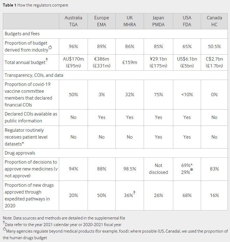 In an article in the BMJ last year, the author illustrated how “Industry money saturates the globe’s leading regulators. The BMJ found that the majority of regulators’ budget—particularly the portion focused on drugs—is derived from industry fees.” This table within that article, summarising the BMJs investigations, presents the stark realities of regulatory capture of our healthcare systems around the world: